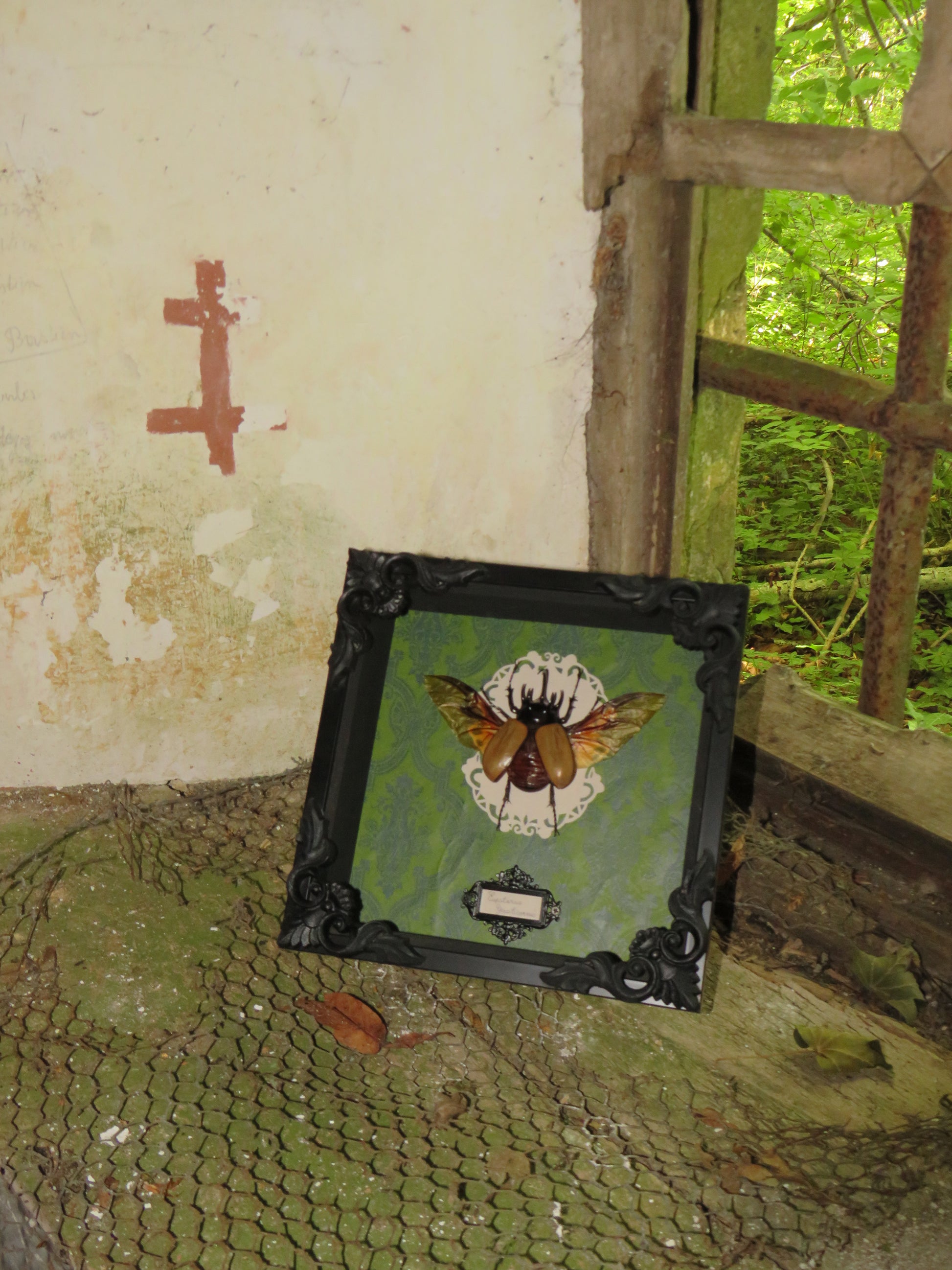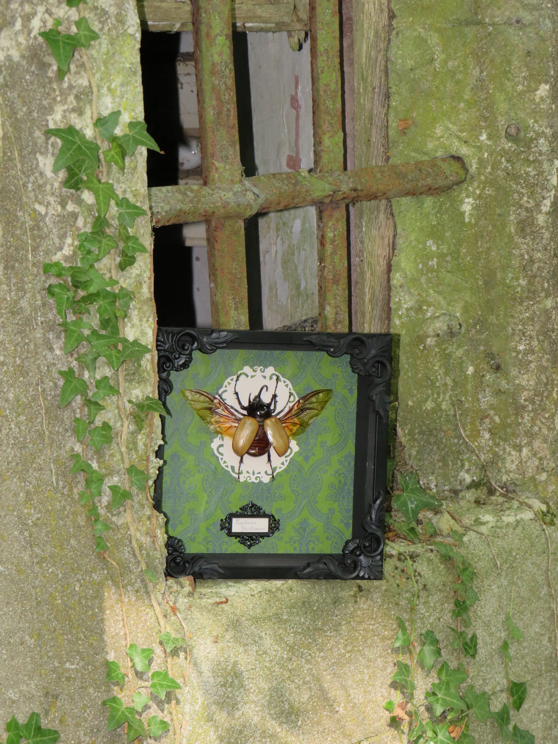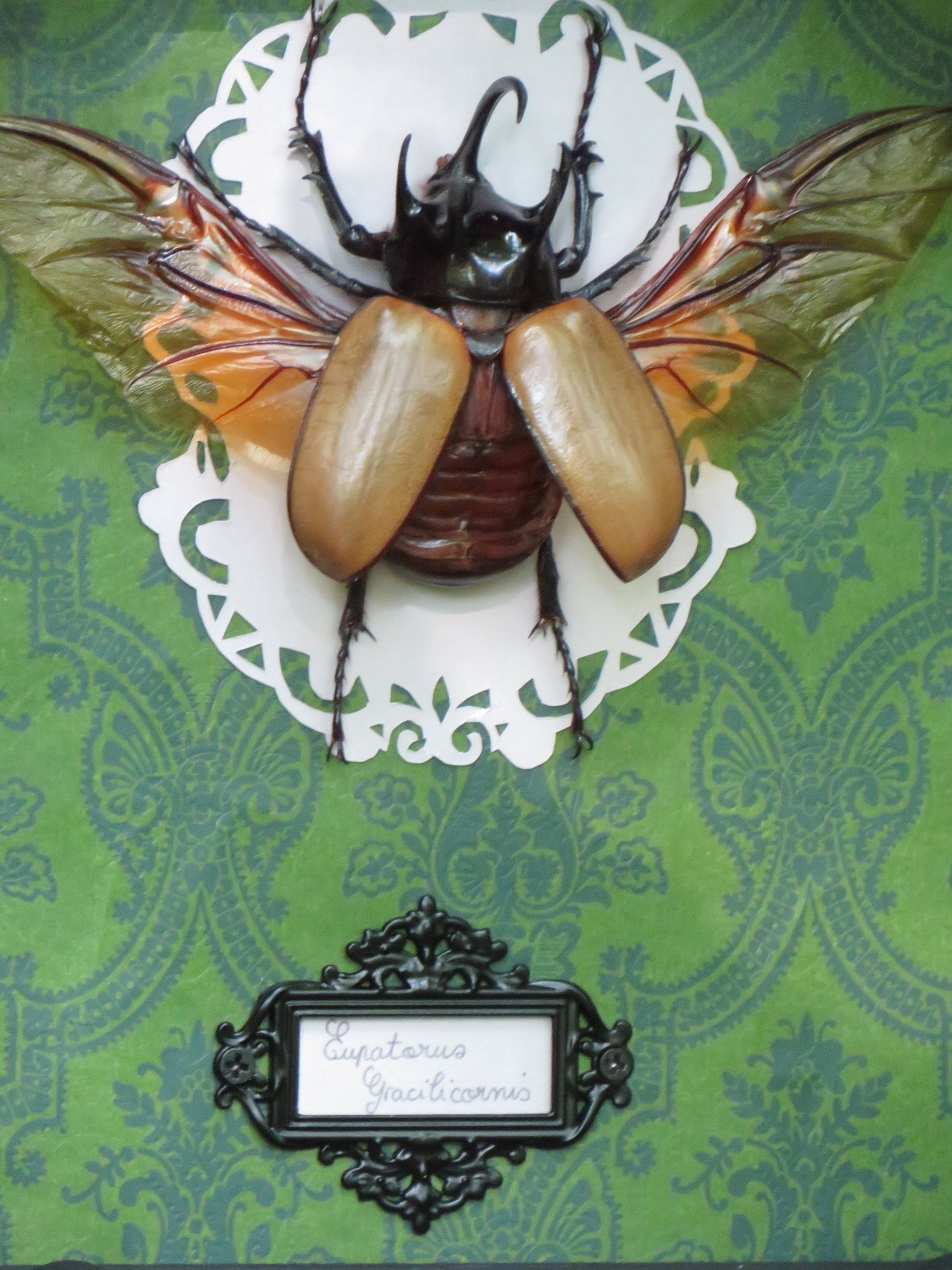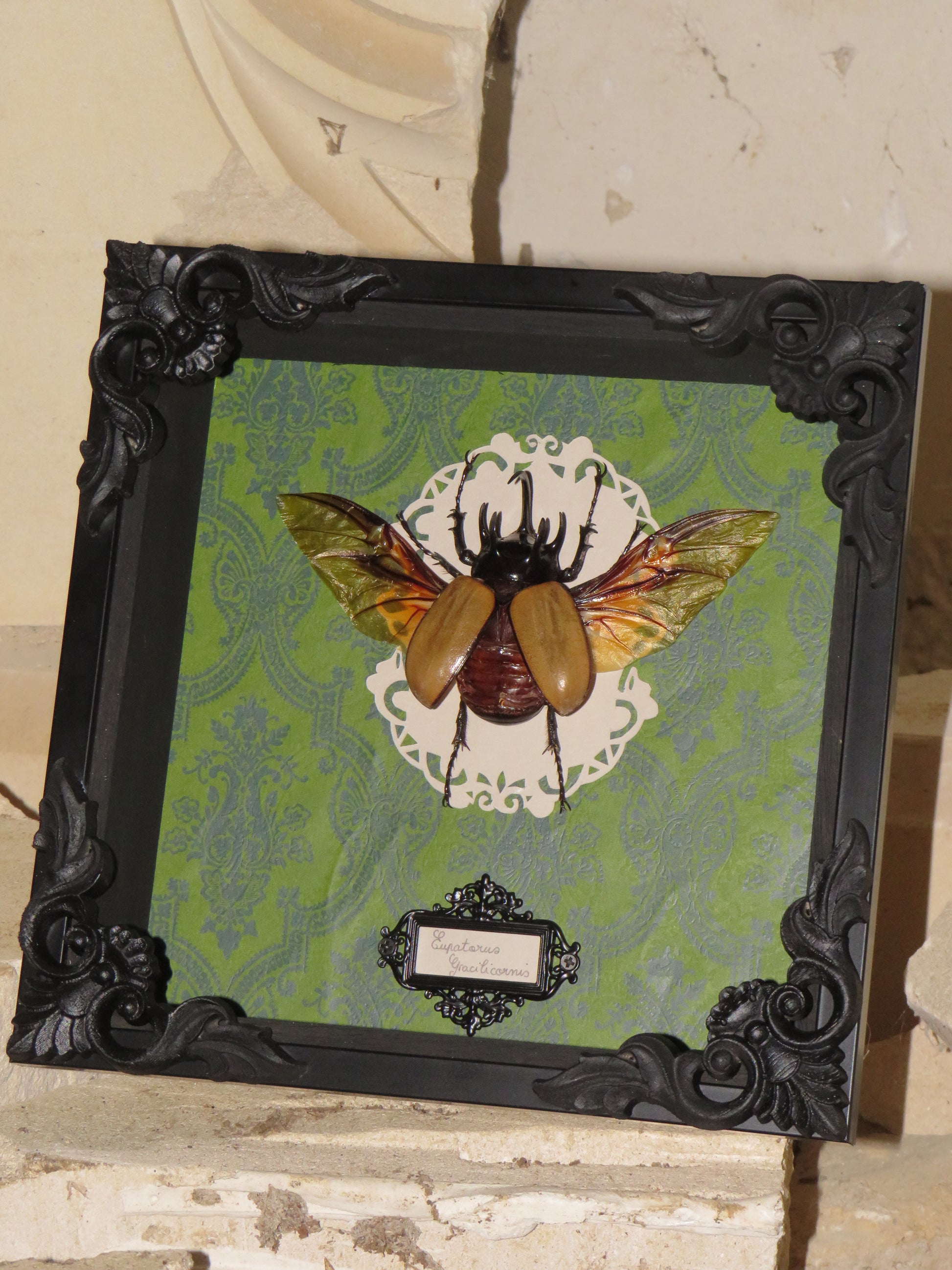 Mais quel beau coléoptère ! L’Eupatorus gracilicornis, imposant avec ses élytres brunâtres et ses grandes cornes. Ici, il est présenté sur un fond baroque verdâtre, délicatement posé sur un petit napperon de papier découpé à la main, et identifié grâce à une étiquette en papier et métal, vissée directement sur le fond du cadre pour une solidité à toute épreuve.