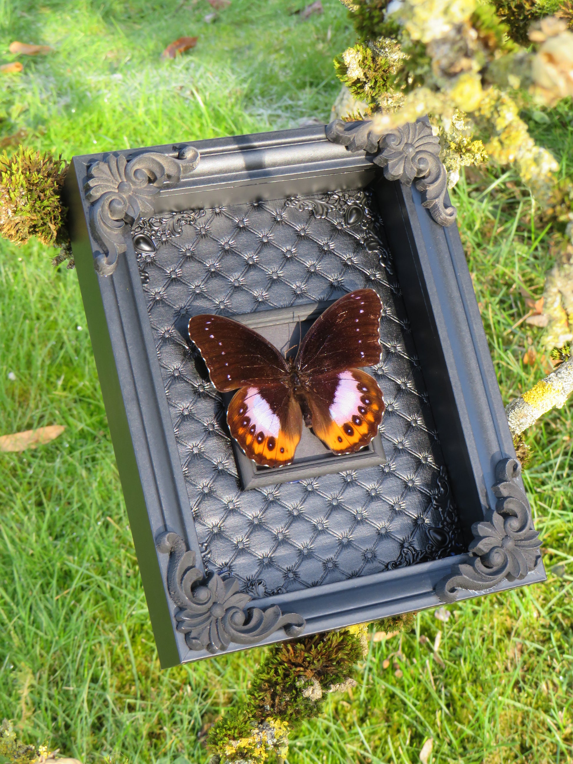 Hypolimnas pandarus, un papillon pas très commun mais pourtant regardez moi ses couleurs ! Le violet mélangé au orange c'est vraiment un superbe combo. Ici mis en valeur sur un fond capitonné en similicuir et moulure en bois sur les coins.