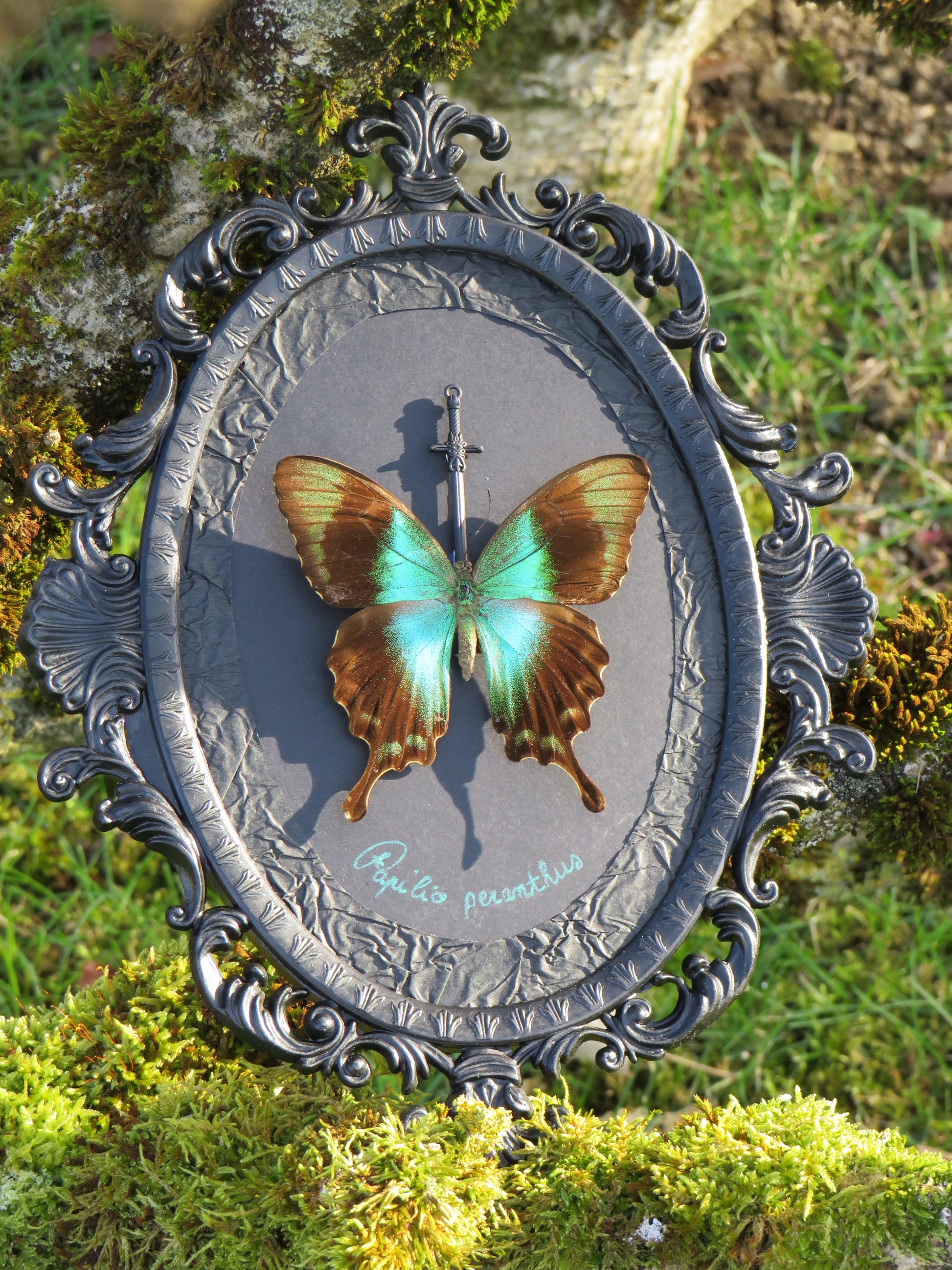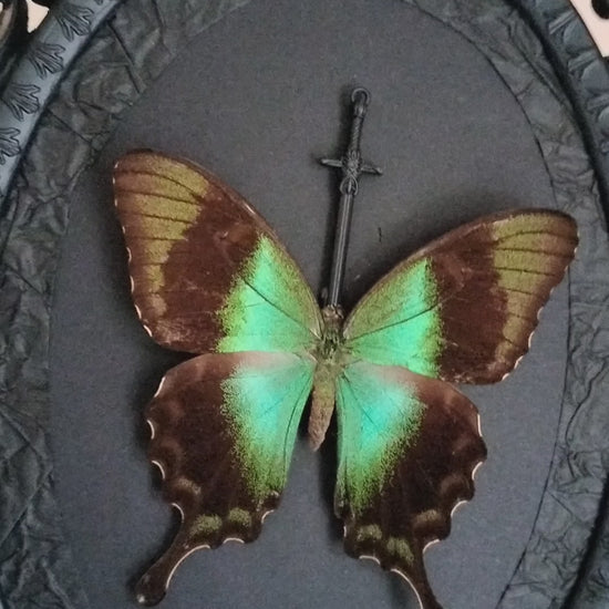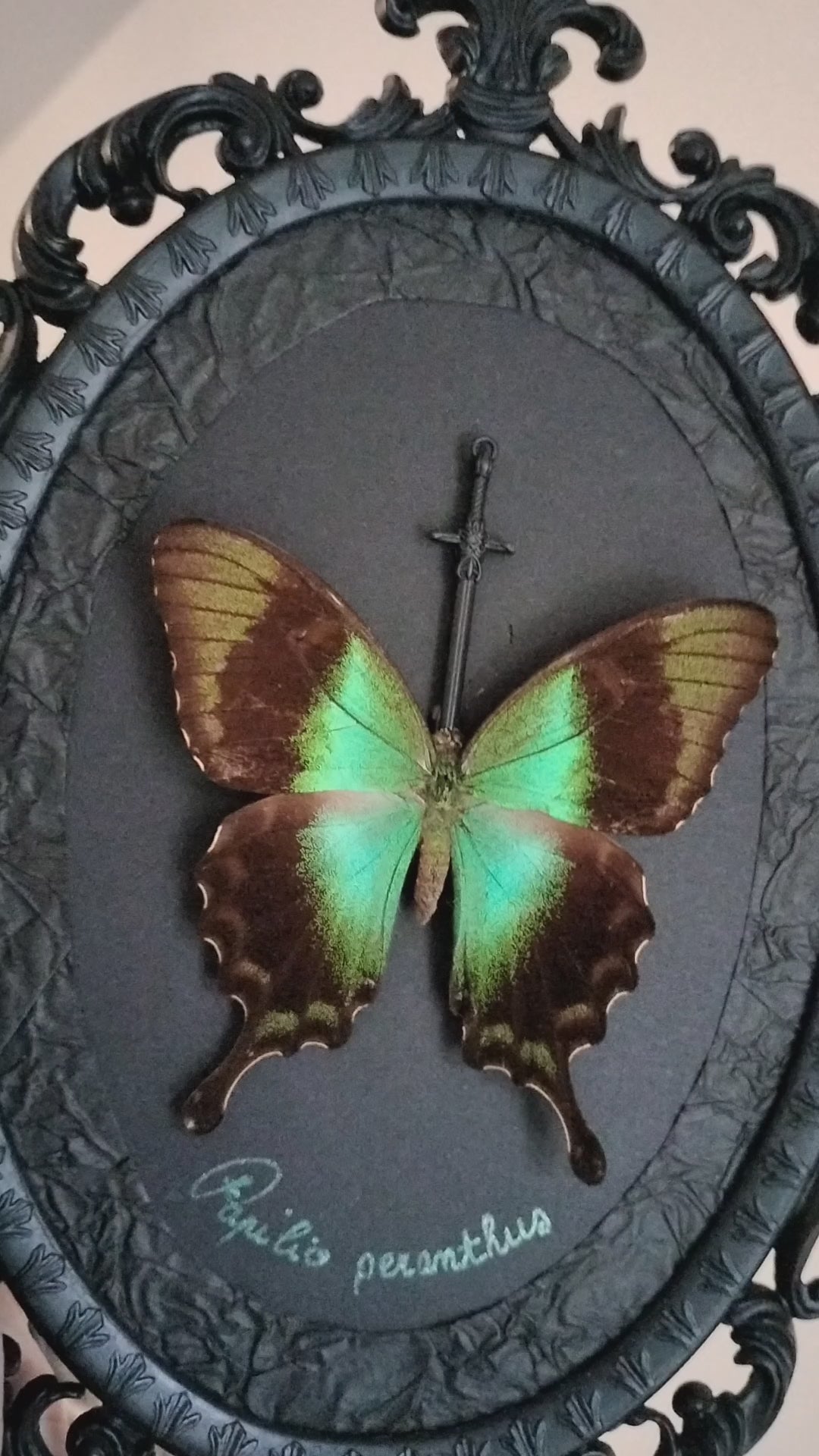 Papilio palinurus superbe, il vire littéralement du turquoise au vert pomme en fonction de la lumière 🥹 l'encre utilisée pour écrire le nom du papillon est pailletée et scintille comme le papillon.