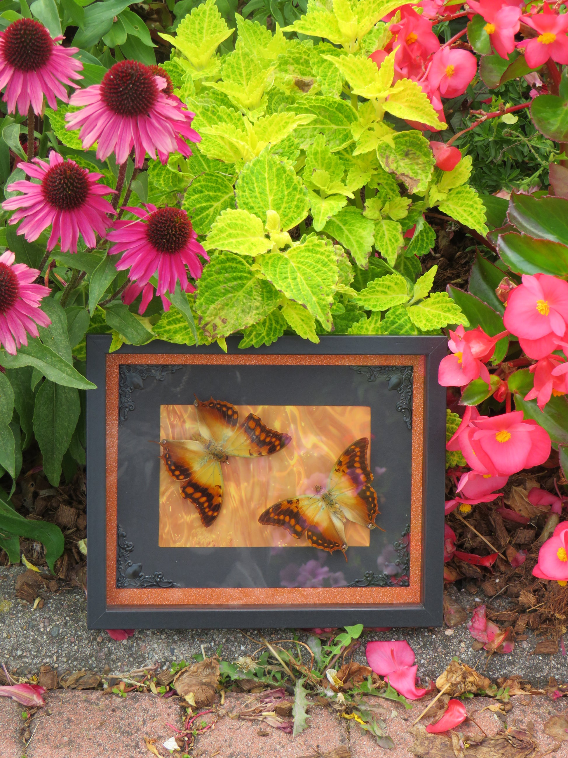 Véritables Papilions Charaxes candiope (2) sur fond d'eau orangé et pailleté et noir avec ornementations afin de bien mettre en valeur ces beaux spécimens