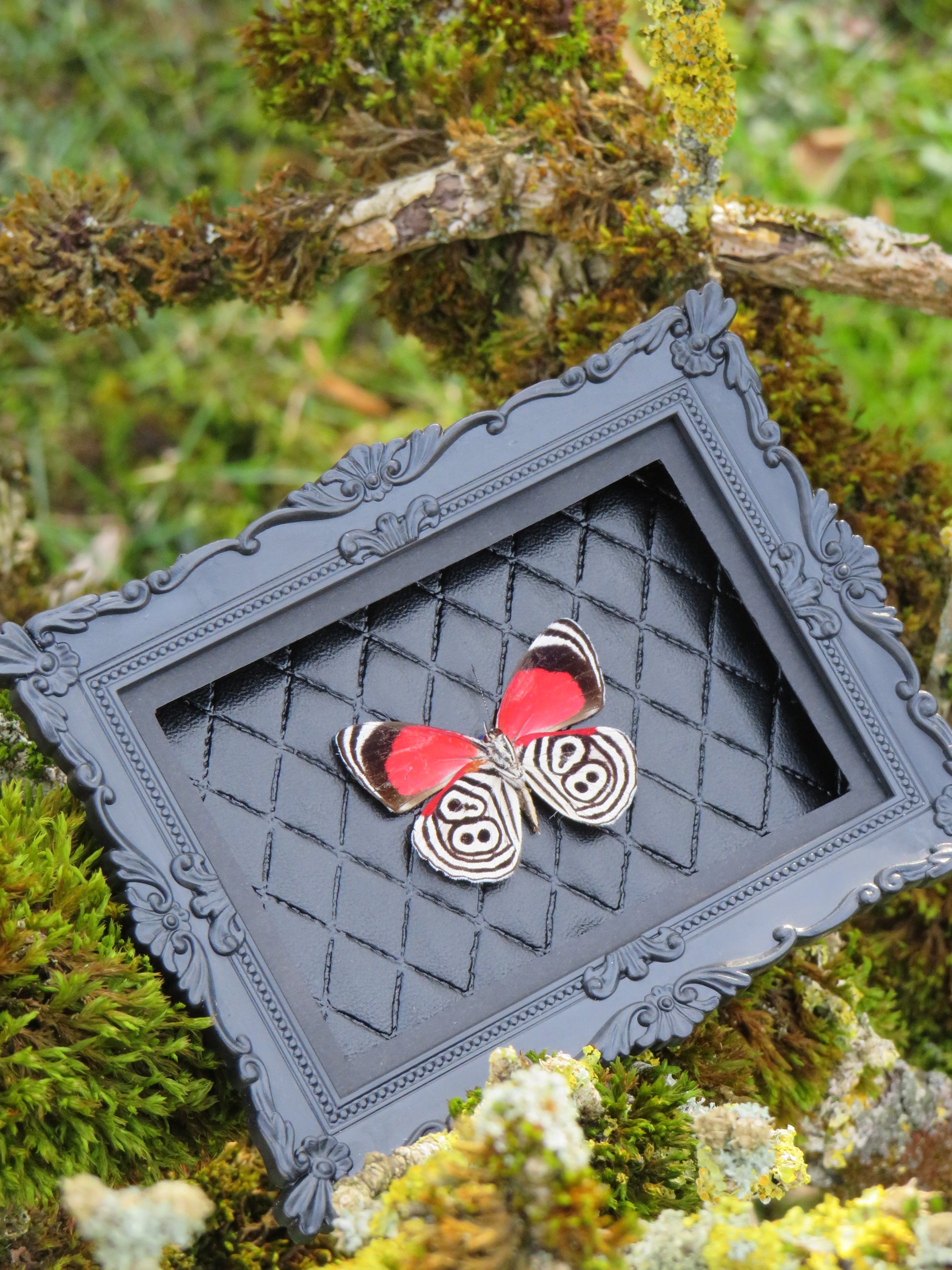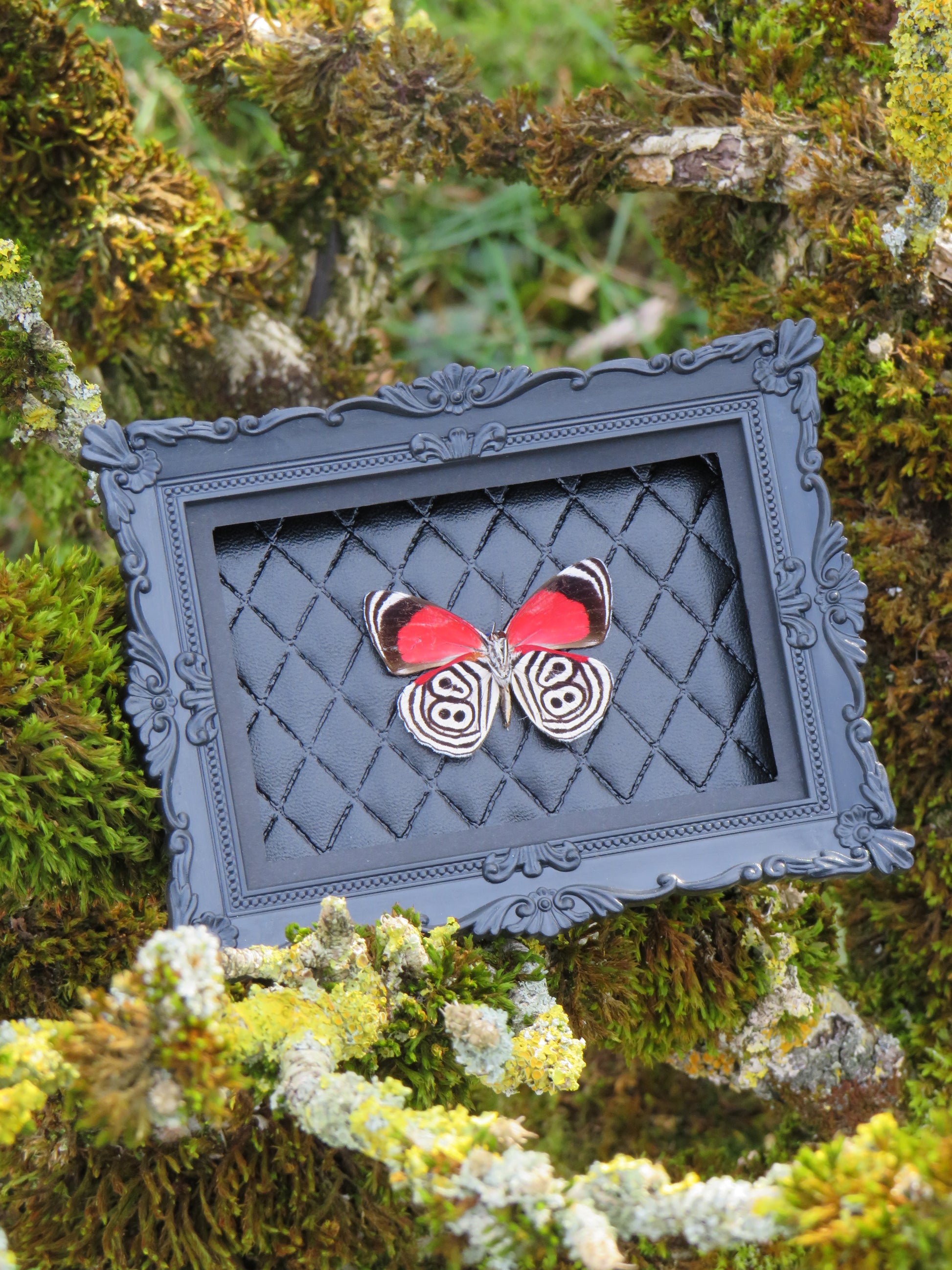 Petit papillon Diaethria clymena de quelques centimètres a peine mais que de beaux motifs et de belles couleurs en un si petit espace ! Bien mis en valeur dans un petit cadre effet baroque et fond capitonné noir en simili cuir.