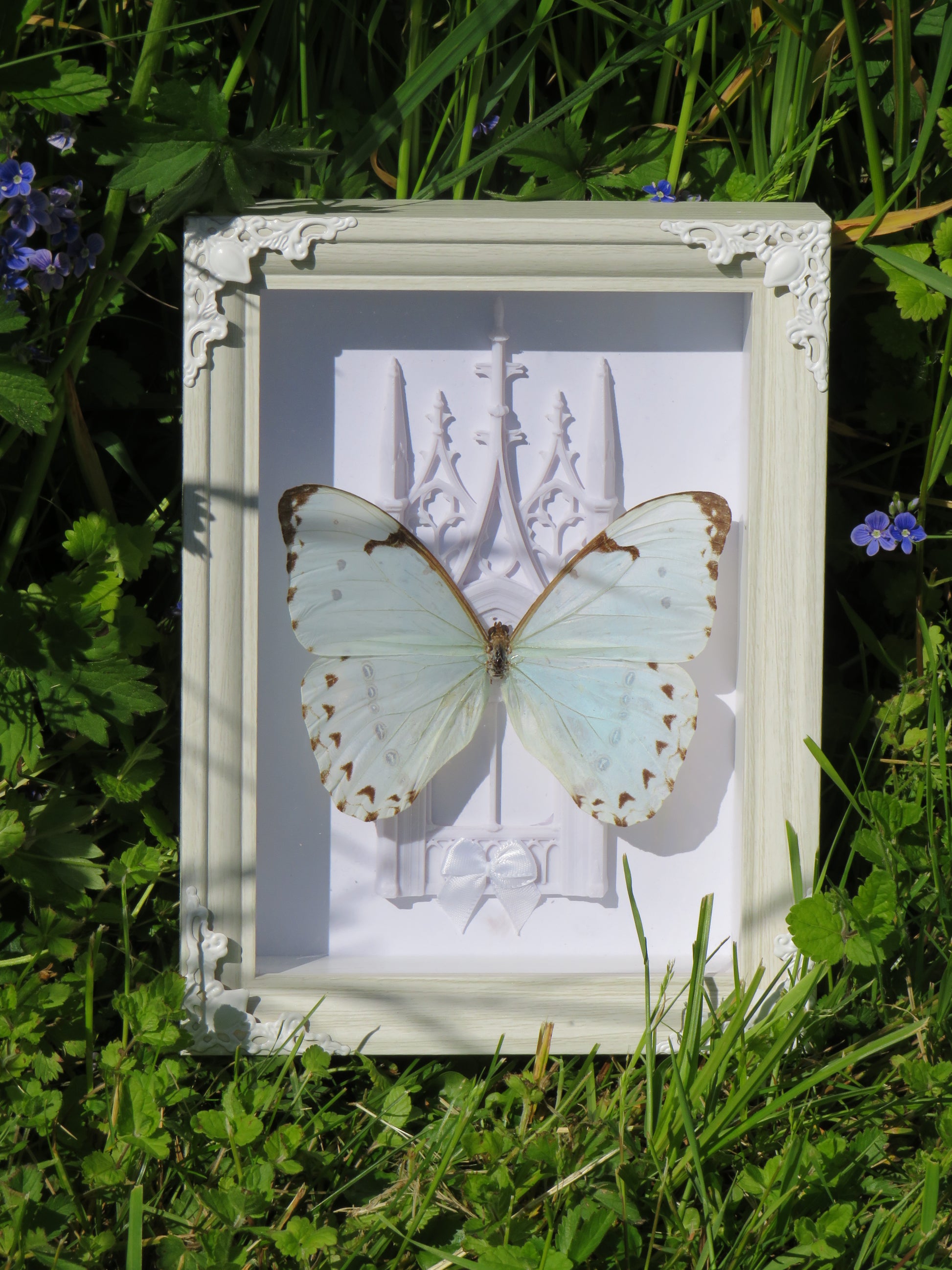 Véritable papillon epistrophus catherina issu d'une ancienne boîte de collection entomologique, monté dans un cadre en bois clair et cathédrale 3D dans le fond