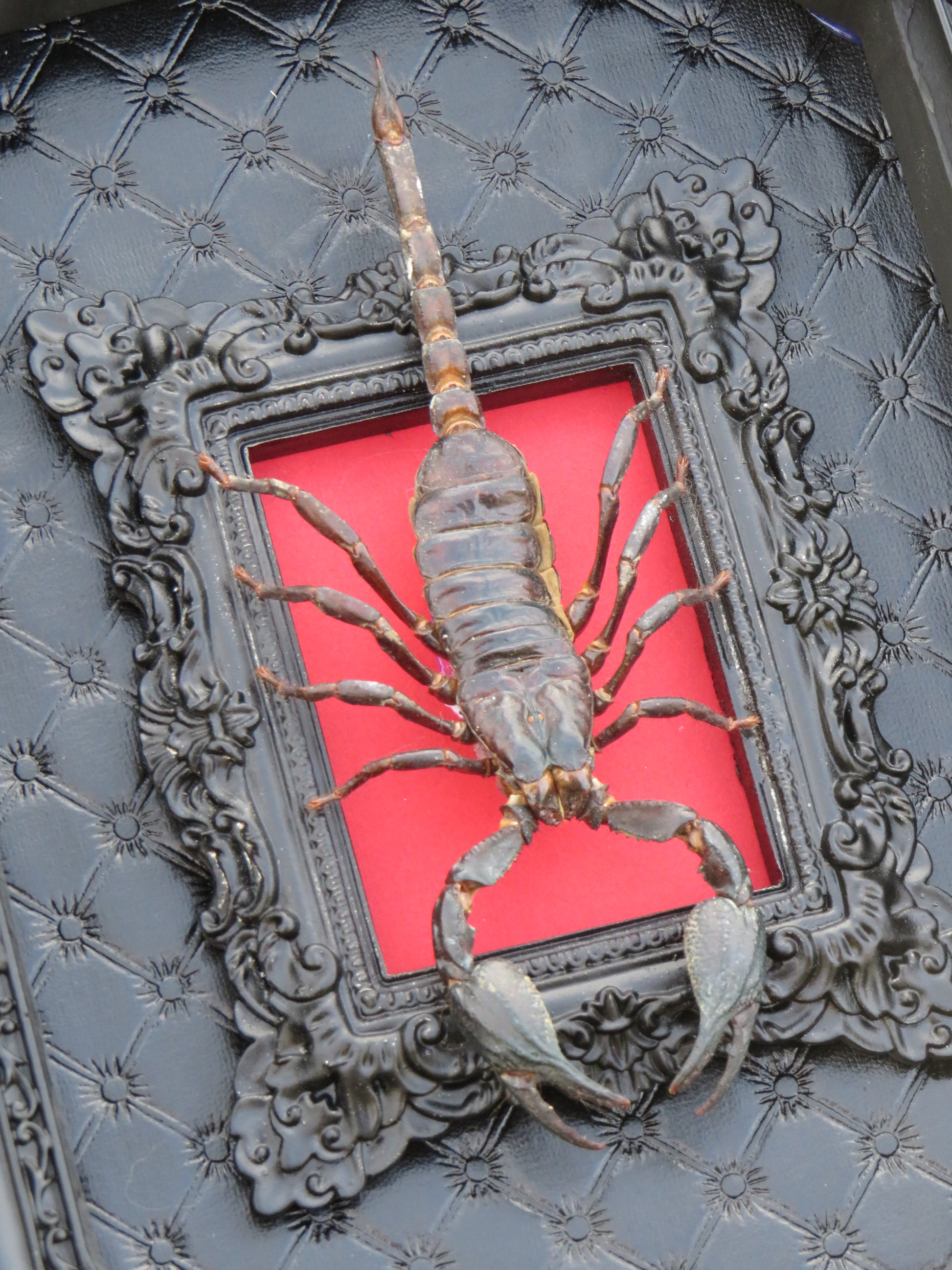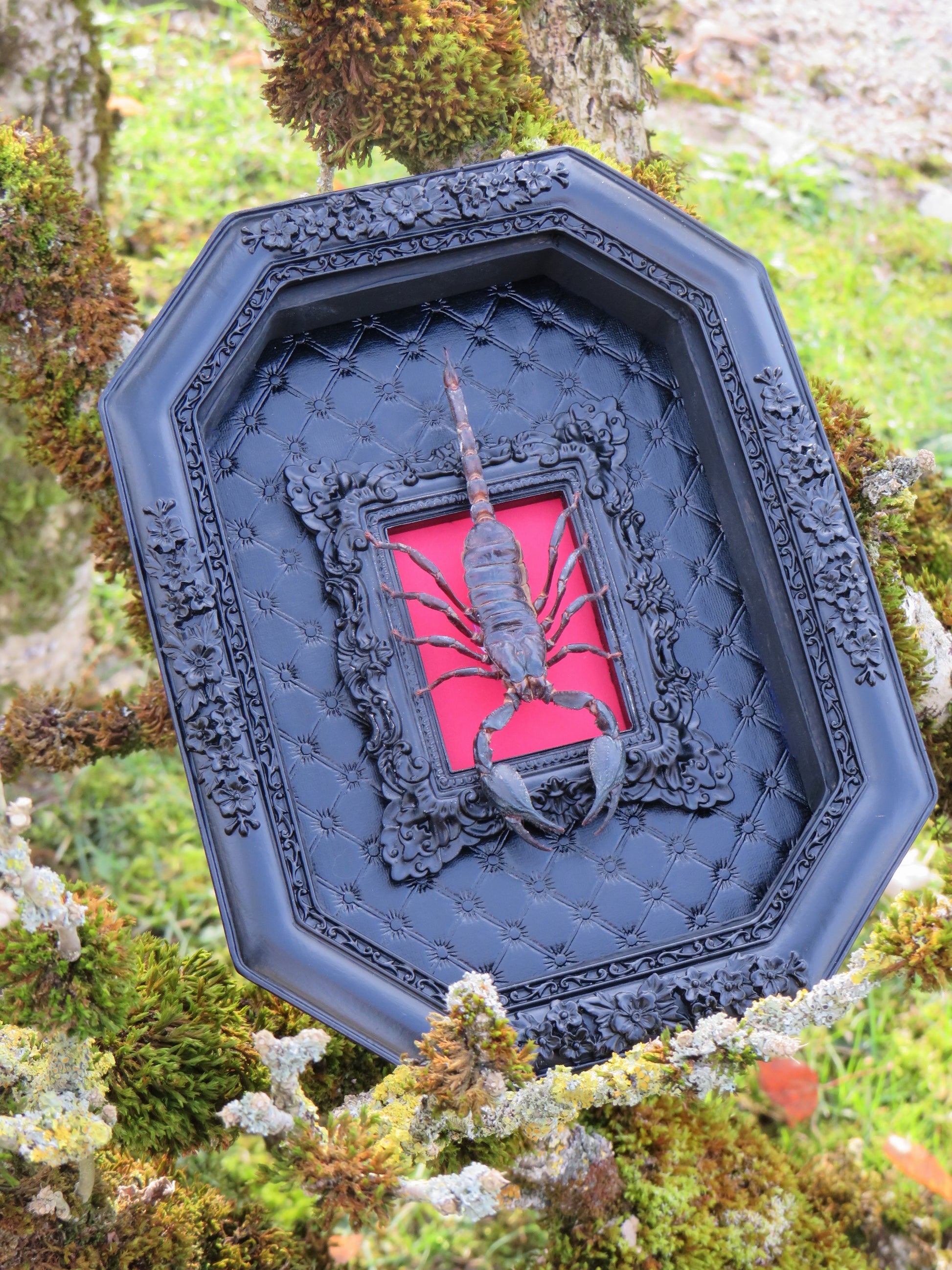 Heterometrus laoticus de taille moyenne, scorpion super mignon dans un cadre à la forme originale (qui a été super chiant à faire...) avec fond capitonné en similicuir noir et centre rouge.
