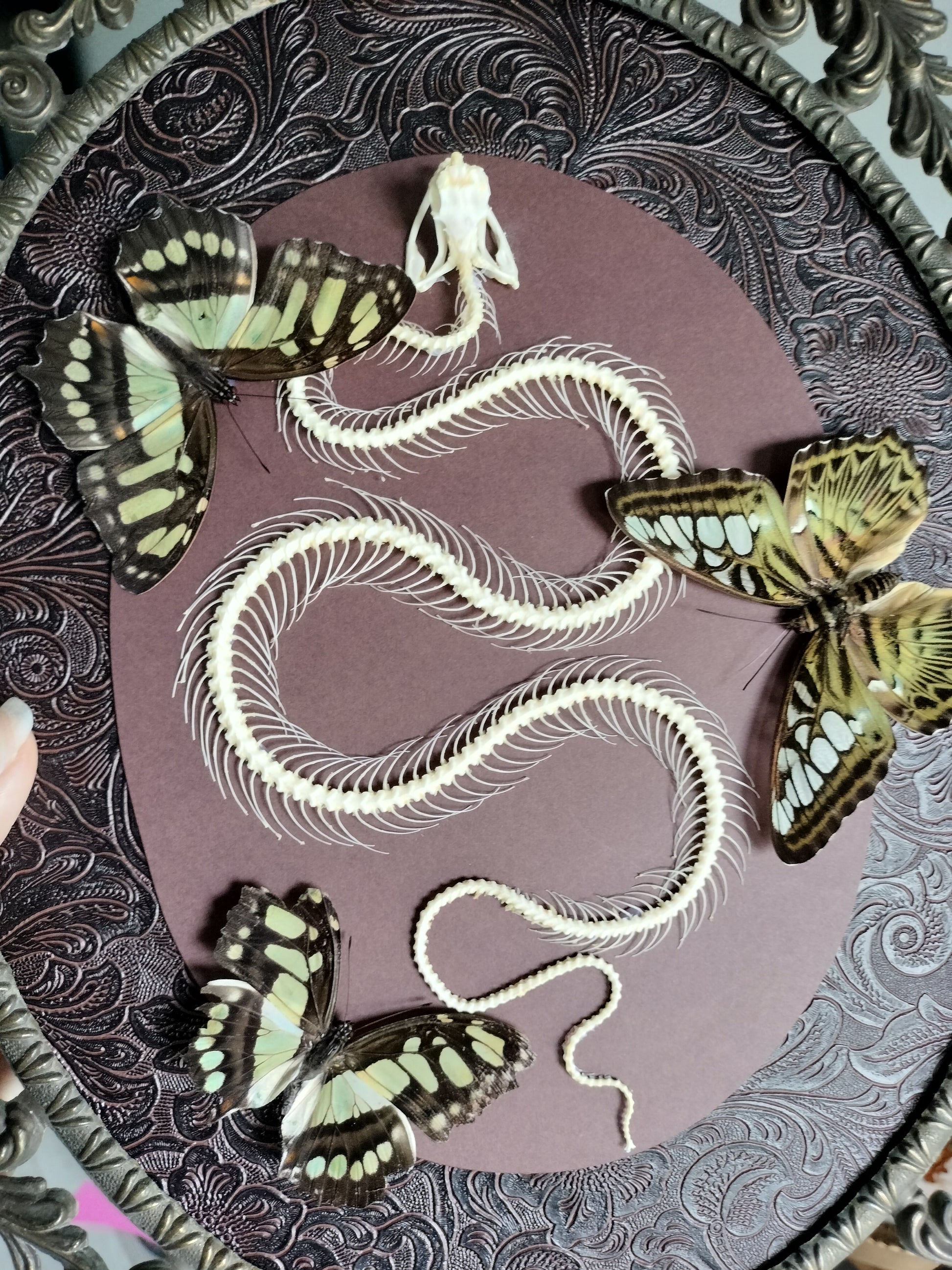 Squelette de serpent trimeresurus albolabris avec deux siproeta stelenes et un Parthenos sylvia. sur fond en similicuir marron gravé floral, et centre brun foncé en papier épais pour ne pas brouiller les éléments.